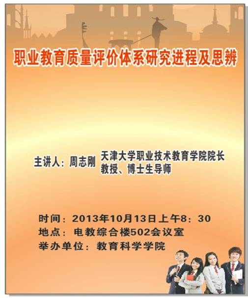 报告人简历:周志刚,中国职业技术教育学会学术委员会委员,天津大学职业技术教育学院院长,教授、博士生导师。周志刚教授长期以来致力于教育管理与评估、人力资源开发与管理 、高等职业教育领域的研究,在北京师范大学出版社、台湾师大书苑有限公司出版《高等学校教育评估》等个人专著多部,在《天津大学学报》、《中国职业技术教育》、《中国高教研究》、《江苏高教》等中文核心期刊发表论文100余篇。主持或参与主持了教育部哲学社会科学研究重大课题攻关项目、教育部职业教育重大课题、全国教育科学“十五”规划课题、全国教育科学“十一五”规划教育部重点课题、教育部高教司重点课题等20多项。个人专著《高等学校教育评估》获全国第二届教育科学优秀成果二等奖,另有多篇论文获得中国高等教育学会、天津市社会科学优秀成果奖。